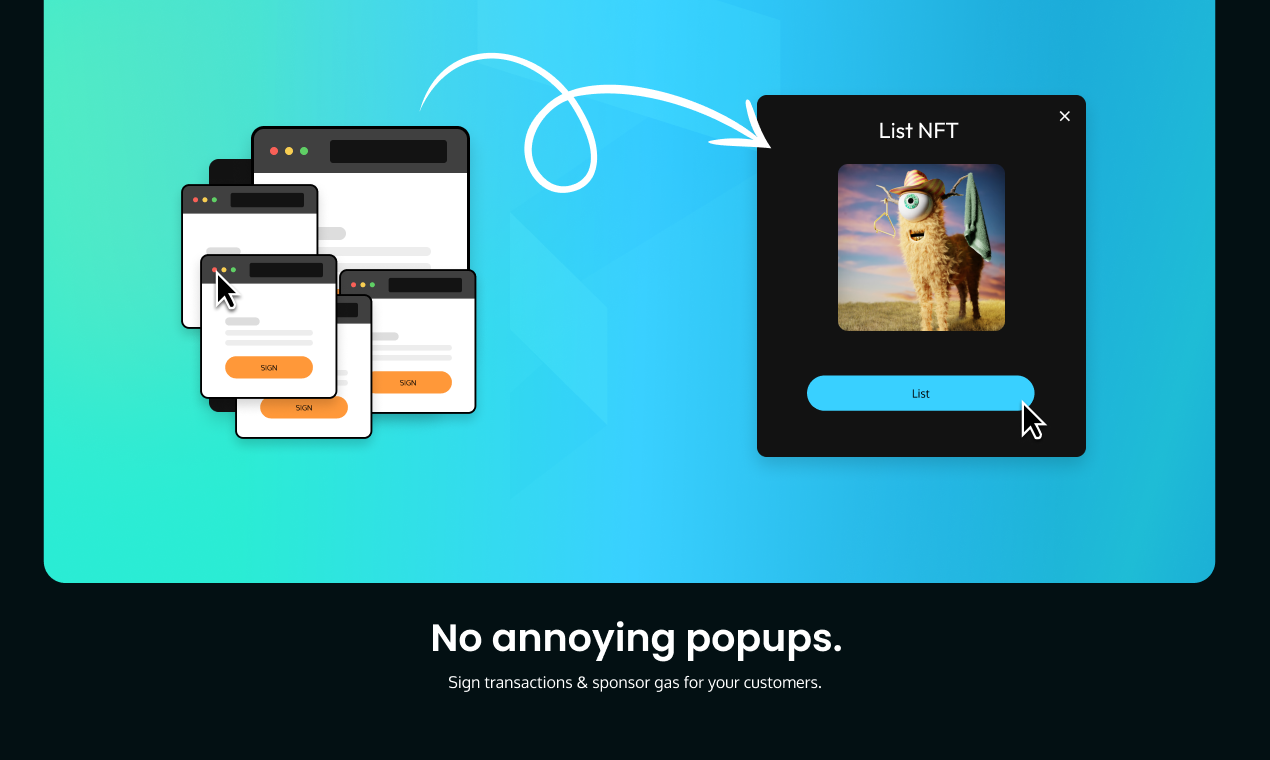 No annoying pop-ups. You can sign messages, authorize transactions, and pay for gas so your users never have to see a pop-up again.