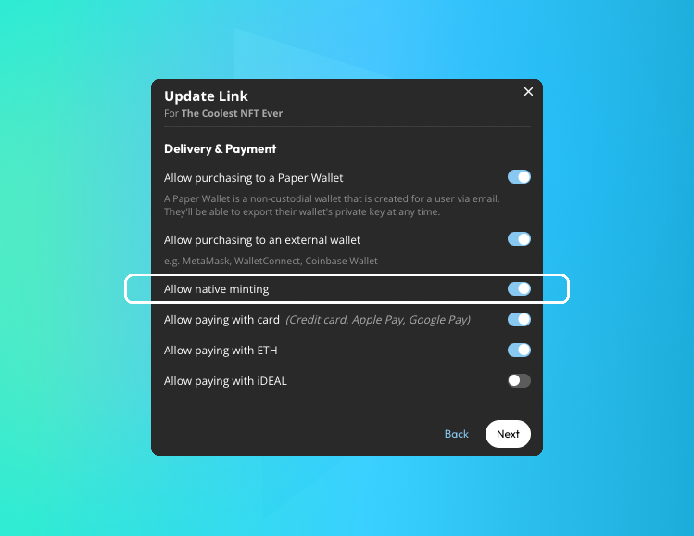 - After entering your collection name and description, navigate to the 'Delivery & Payment' page and ensure 'Allow native minting is toggled on