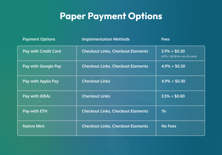 At Paper, we provide multiple ways for you to reach your audience regardless of their crypto knowledge. We currently support the following payment methods with more to come: