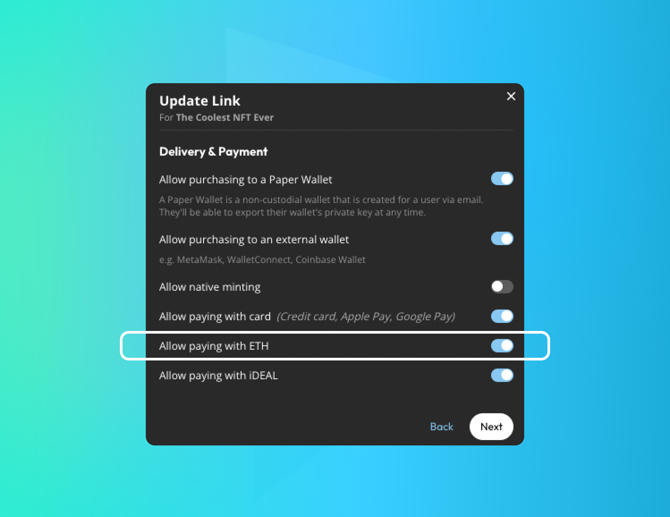 - After entering your collection name and description, navigate to the 'Delivery & Payment' page and ensure 'Allow paying with ETH' is toggled on