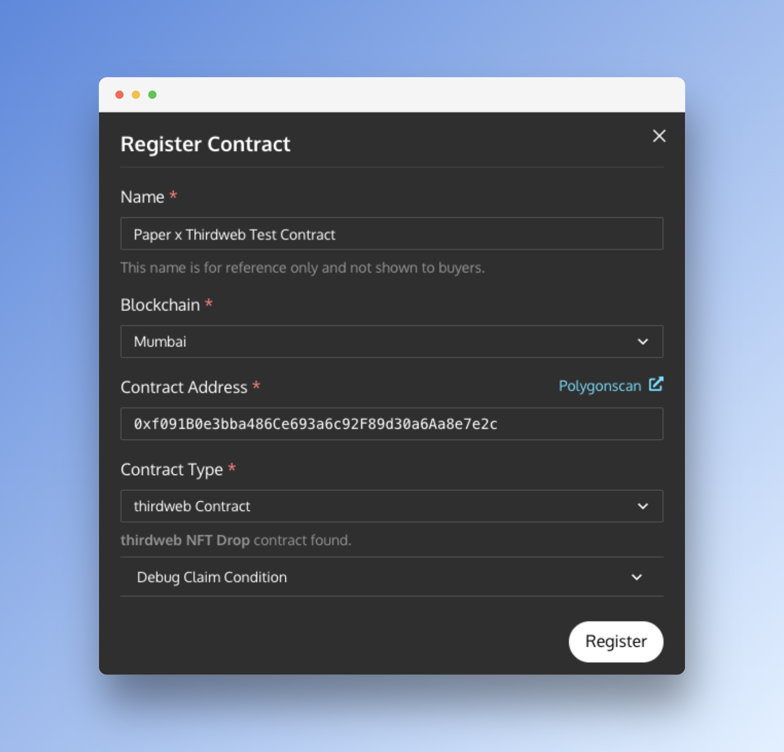 Make sure to choose the right chain (Mumbai or Polygon mainnet), thirdweb as a Contract Type, and paste your contract address (from your thirdweb dashboard).