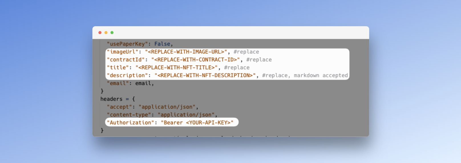 3. Replace the placeholder text with your API key, contract ID, NFT title, NFT description, and NFT image URL