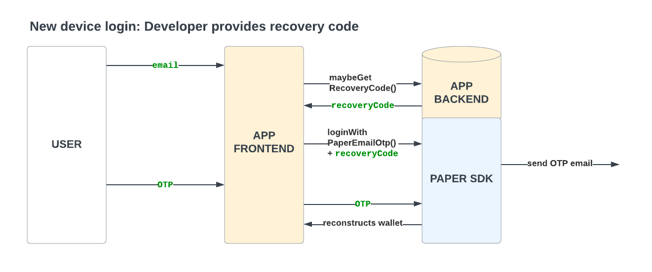 - Retrieve the recovery code from your backend and provide it to the SDK when a user signs in.