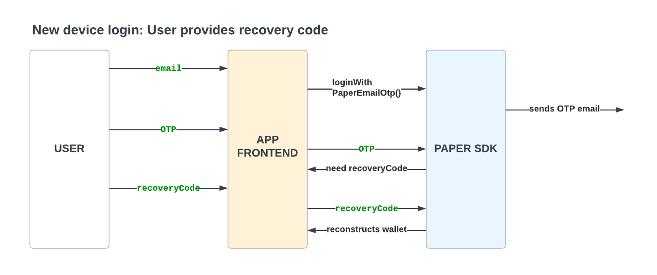 savedRecoveryCodetologinWithPaperEmailOtp()- If the auth flow requires a recovery code, it will use this code. If a recovery code is not required, this argument is ignored. An exception will be thrown if the recovery code is incorrect.